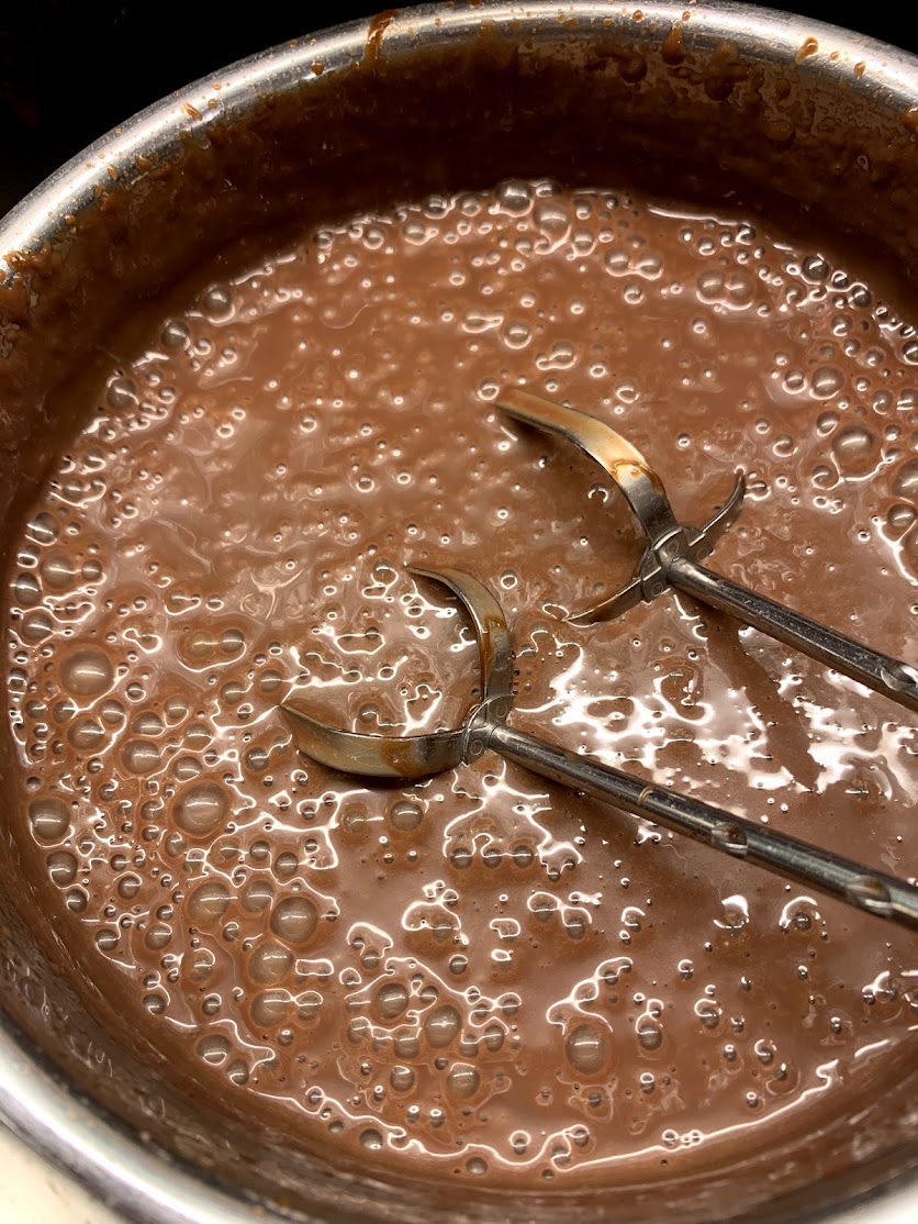 - Tencereye koyduğunuz çikolata eriyince mikserle yüksek devirde iyice çırpın.